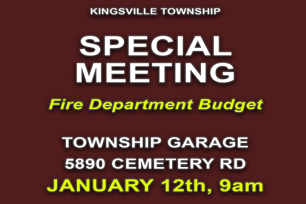 The Kingsville Township Board of Trustees will hold a Special Meeting to discuss the Fire Department budget on Monday, January 12, 2025 at 9:00am at the Kingsville Township Garage, 5890 Cemetery Rd.