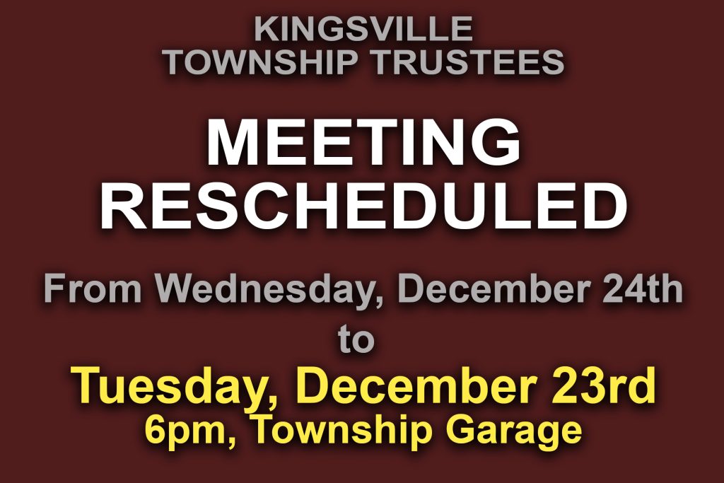 The regular meeting of the Kingsville Township Trustees for December 24th, 2025 (2nd Wednesday of the month) has been rescheduled to Tuesday, December 23rd, 2025 at 6pm at the Township Garage, 5890 Cemetery Rd.